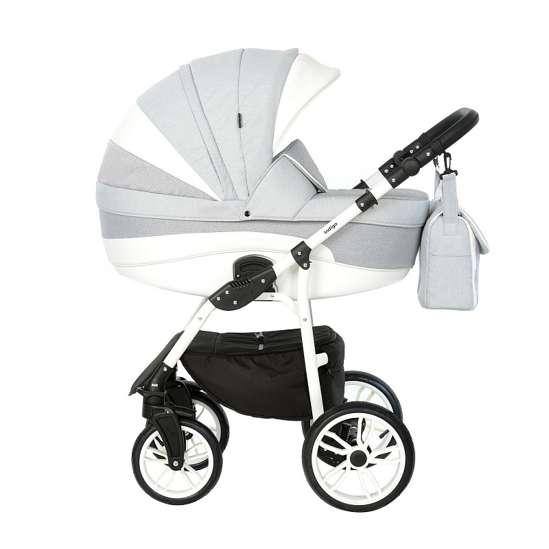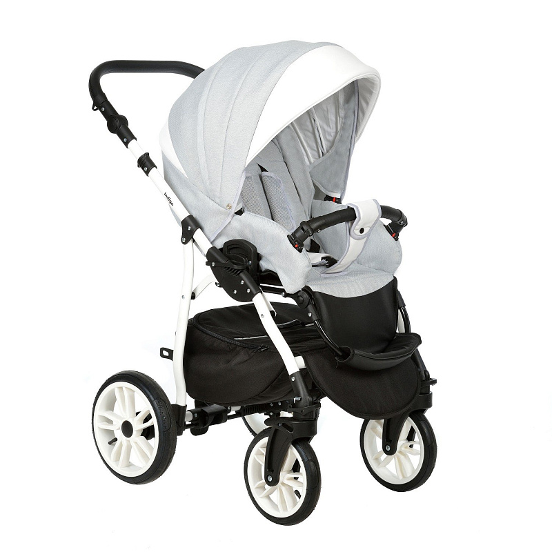 Рама облегченная, алюминиевая. Модули крепятся к ней с помощью системы One Touch Sistem, которая существенно упрощает задачу родителям. Амортизаторы в коляске Indigo пружинные, тормоз центральный — Stop&Go. Благодаря системе выдвижных осей эту модель можно свободно перевозить в багажнике автомобиля, не боясь ничего поцарапать. Багажная корзина текстильная, закрытого типа. Колеса резиновые, надувные, с поворотной опцией у передних.