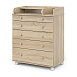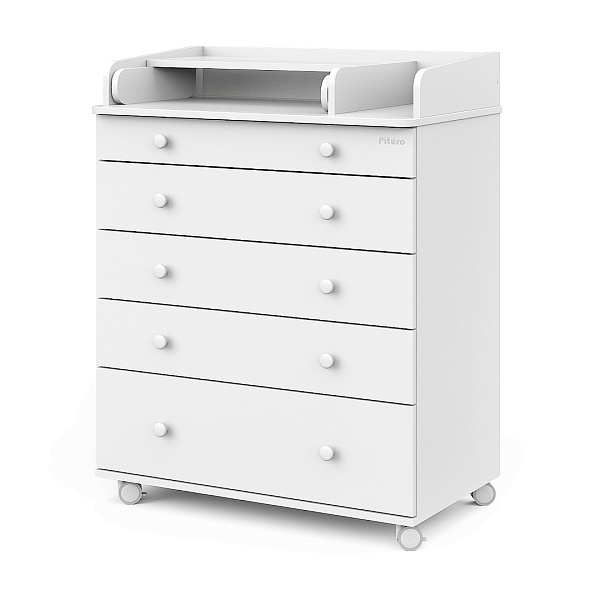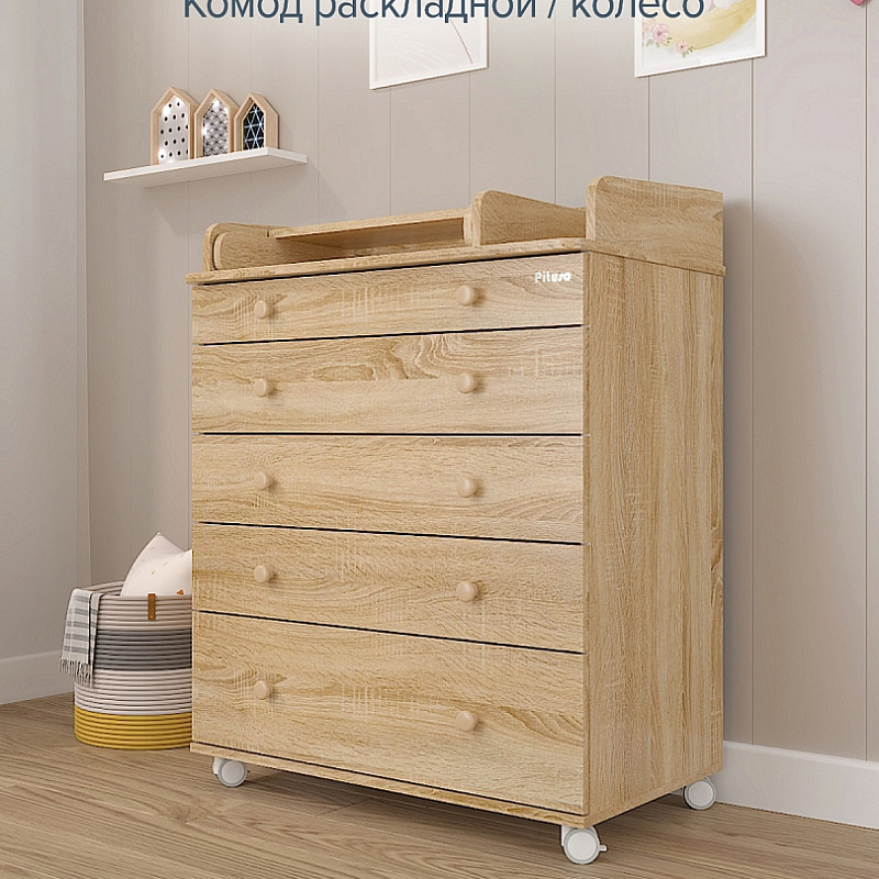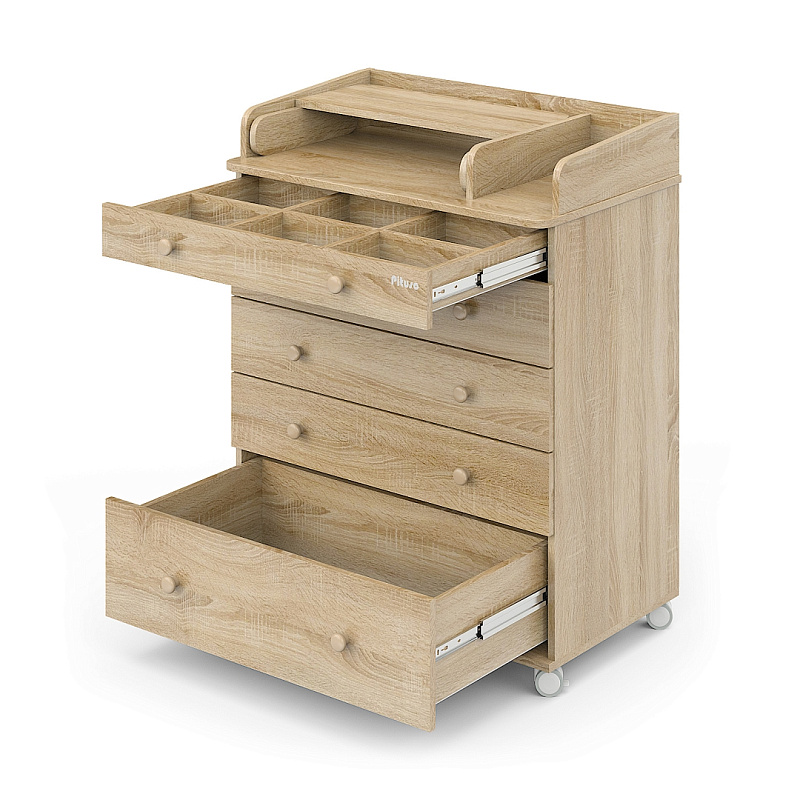 Комод снабжен раскладным столиком для пеленания и пятью ящиками разной глубины. Есть простой и надежный скрытый механизм раскладывания. Имеется отделение возле столика для средств гигиены. Ящики бесшумные, оснащены шариковыми направляющими.
